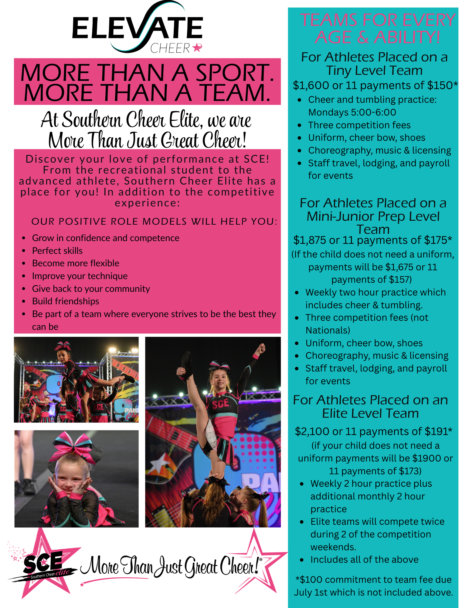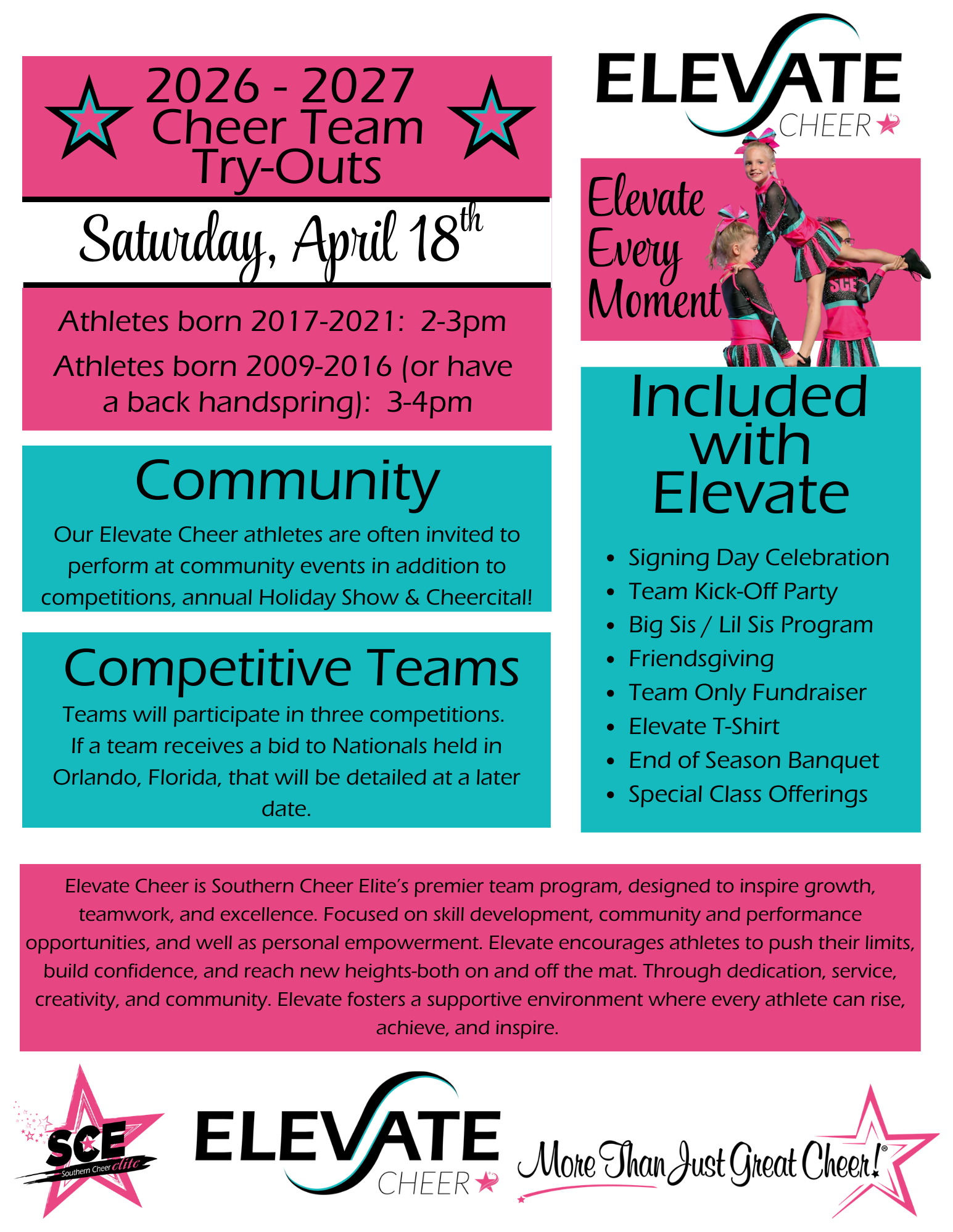 Welcome to Southern Cheer Elite! We are a cheerleading gym with a focus on cheer, tumbling, and gymnastics dedicated to nurturing talent, building skills, and fostering a strong sense of teamwork and sportsmanship. With our experienced coaches, and passion for cheer, tumbling, and gymnastics, we offer an unparalleled positive training experience for athletes of all ages and skill levels. Whether you're a beginner looking to discover the joy of cheer, tumbling or gymnastics or a competitive athlete striving for a collegiate career Southern Cheer Elite is the place where you can unleash your potential and shine like a true star. Join us on this journey and let us ignite your passion for cheerleading!